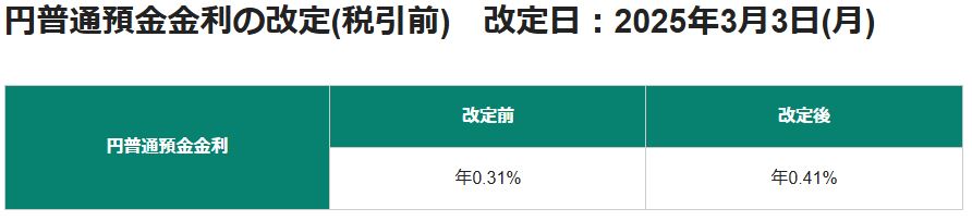 円普通預金金利が0.41%と非常に高く、給与受け取り口座にするなどメインバンクとして使えば、投資に回していない預金も高金利で預けられます。